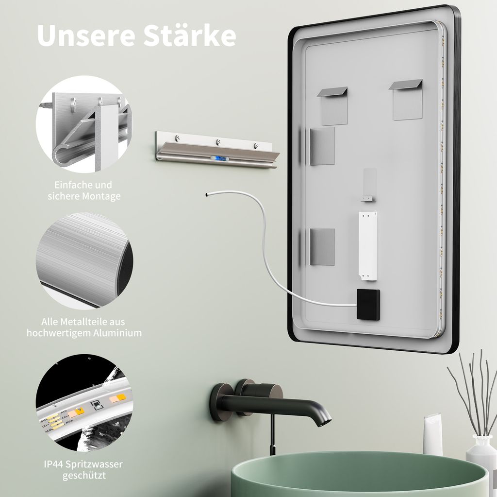 Geringer Stromverbrauch, Energieeffizienzklasse F Plus Uhr & Antibeschlag, 1 Badzimmer 2 Wohnzimmer 3 Schlafzimmer 1 höchste Qualität 2 IP44 Wassergeschützt 3 sichere Verpackung Wechsel der Lichtfarbe: Kaltweiß zu Warmweiß / Warmweiß zu Kaltweiß: Legen Sie bei eingeschaltetem Licht den Finger dauerhaft auf den Touch-Schalter, dann wechselt das Licht von Warmweiß auf Kaltweiß. LED beleuchteter Touch- / Sensorschalter reagiert auf leichte Berührung. Bequem durch Berühren des Touch Schalters einzustellen. Ein Badspiegel 50x70 mit Beleuchtung von ist die ideale Wahl für Ihr Badezimmer. Unsere in Deutschland designten Spiegel überzeugen mit moderner LED-Beleuchtung, Antibeschlag-Funktion und einfacher Montage (Erklärung der Memory-Funktion: Das Licht wurde am Spiegel eingeschaltet = Licht AN und Licht AUS über den Wandschalter steuern) Die Modelle im Vergleich Spiegelschrank Bad Mit Beleuchtung AQUABATOS Wandspiegel Badspiegel Badezimmerspiegel Mit Beleuchtung Ablage 80x60 70x50cm Beschlagfrei Kaltweiss Energiesparend Dimmbar Touch S0y850rg Bad Spiegel Mit Licht Montageanleitung und Zubehör zur Montage an Massiv-Wänden. HOKO - Ihr Spezialist für LED beleuchtete Badezimmerspiegel. Spiegel Mit Beleuchtung Touch Mit Uhr 50x70 Cm Vertikal Badspiegel Led Badezimmerspiegel Mit Licht 3 Fach Wandschalter Warmwei 82289488 Badspiegel it Lapen – Die 15 besten Produkte i Vergleich - BetterFaily So lässt sich dieser LED Lichtspiegel bequem mit dem Lichtschalter aus- und einschalten. Die in den Spiegel integrierte Heizmatte sorgt für ein klares Spiegelbild und verhindert das Beschlagen der Spiegeloberfläche bei hoher Luftfeuchtigkeit!